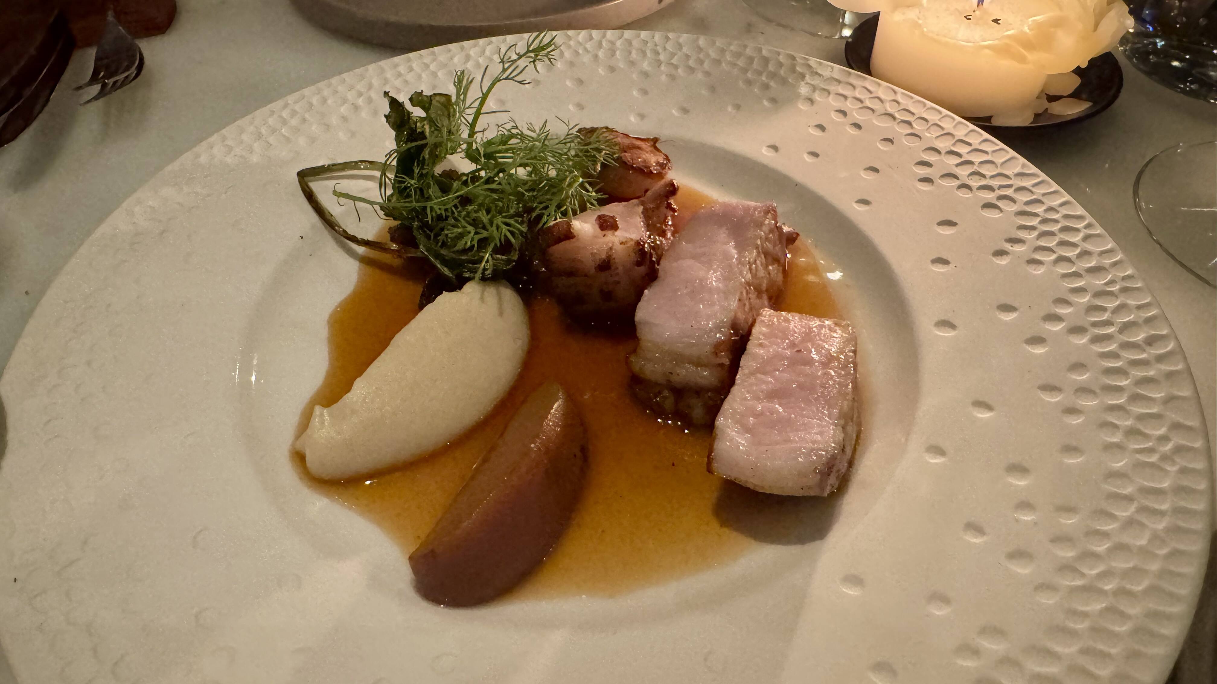 Then. A grilled monkfish tail, the size of your fucking forearm.. lacquered in passionfruit and served with a crab bisque: the fish had a charred, satin‑glaze of tropical brightness, the bisque was deep and shell‑rich. The passionfruit’s zing pushing the crab into a new context. What a dish! Vivid yet balanced, inventive but sure as hell not gimmicky.